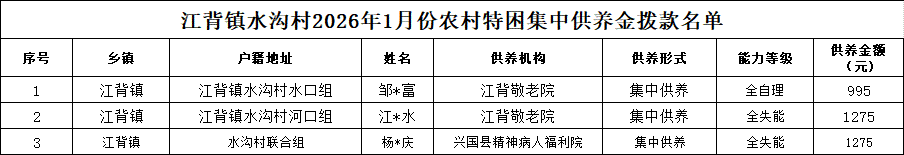 【社會救助】江背鎮水溝村2026年1月份農村特困集中供養金撥款名單