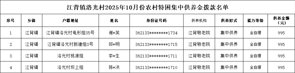 【社會救助】江背鎮洛光村2025年10月份農村特困集中供養金撥款名單