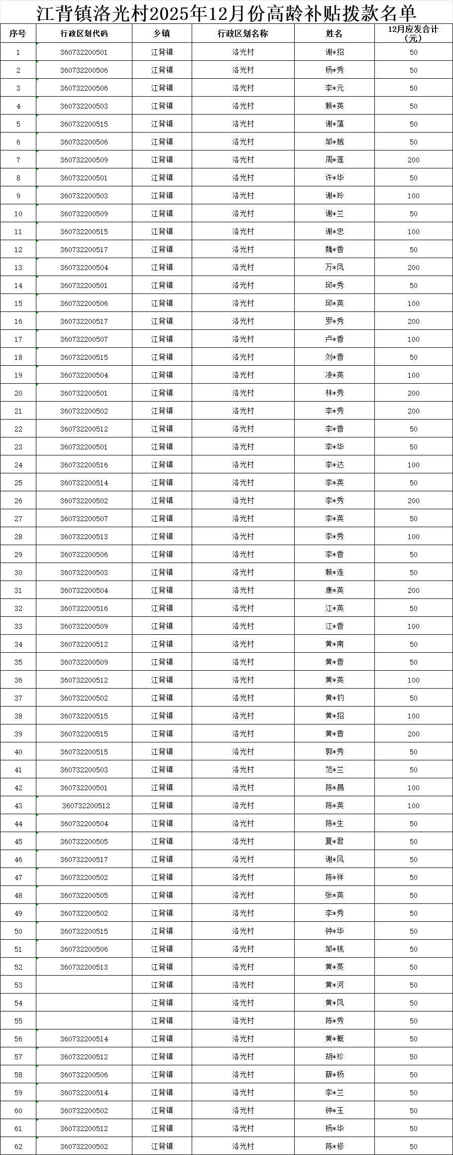 【養老服務】江背鎮洛光村2025年12月份高齡補貼撥款名單