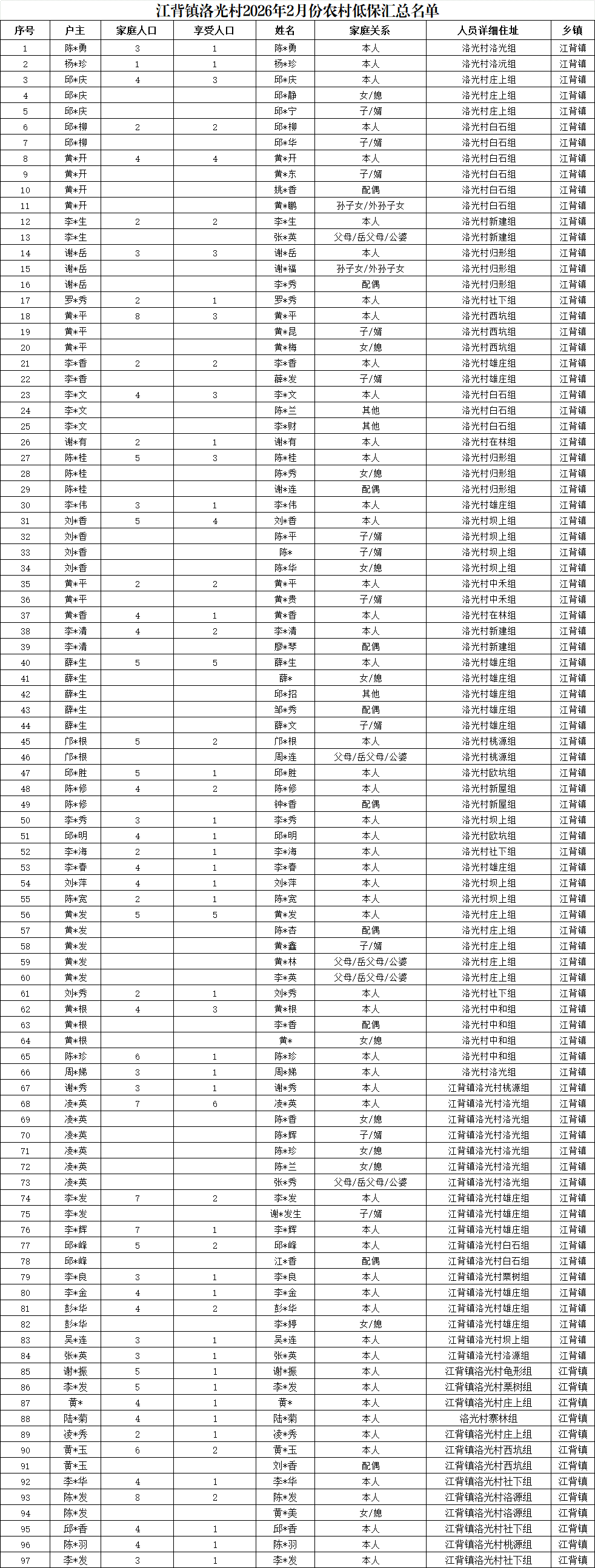 【社會救助】江背鎮洛光村2026年2月份農村低保匯總名單