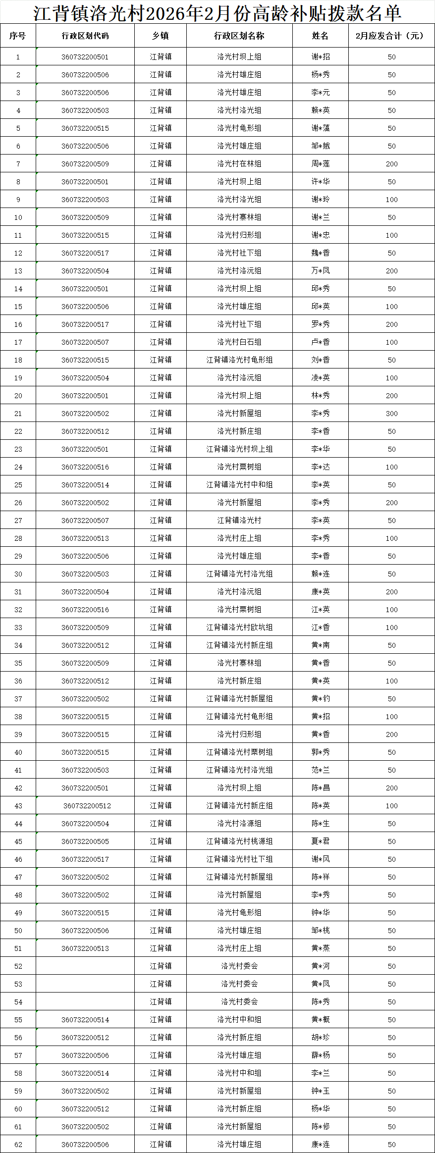 【養老服務】江背鎮洛光村2026年2月份高齡補貼撥款名單