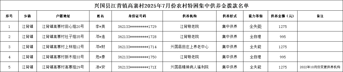 【社會救助】興國縣江背鎮(zhèn)高寨村2025年7月份農村特困集中供養(yǎng)金撥款名單