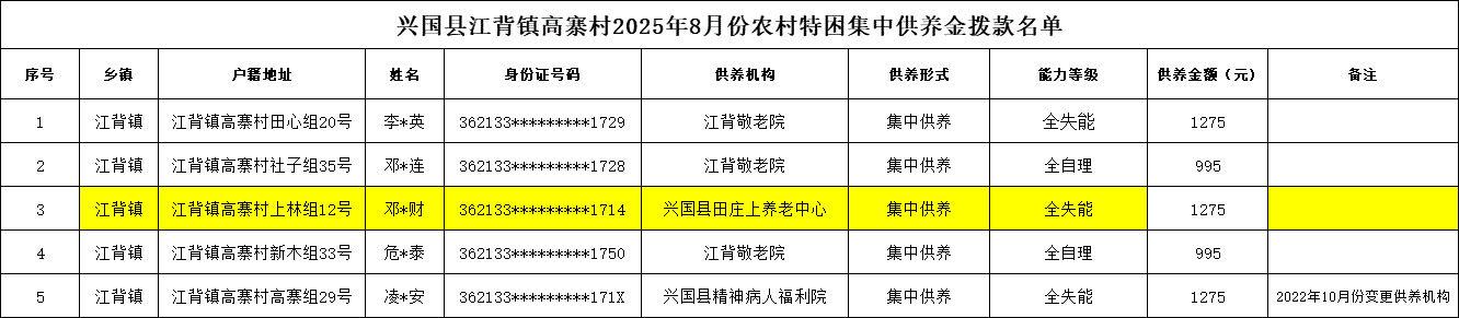 【社會救助】江背鎮(zhèn)高寨村2025年8月份農(nóng)村特困集中供養(yǎng)金撥款名單