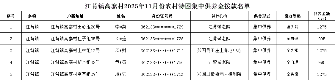 【社會救助】江背鎮高寨村2025年11月份農村特困集中供養金撥款名單
