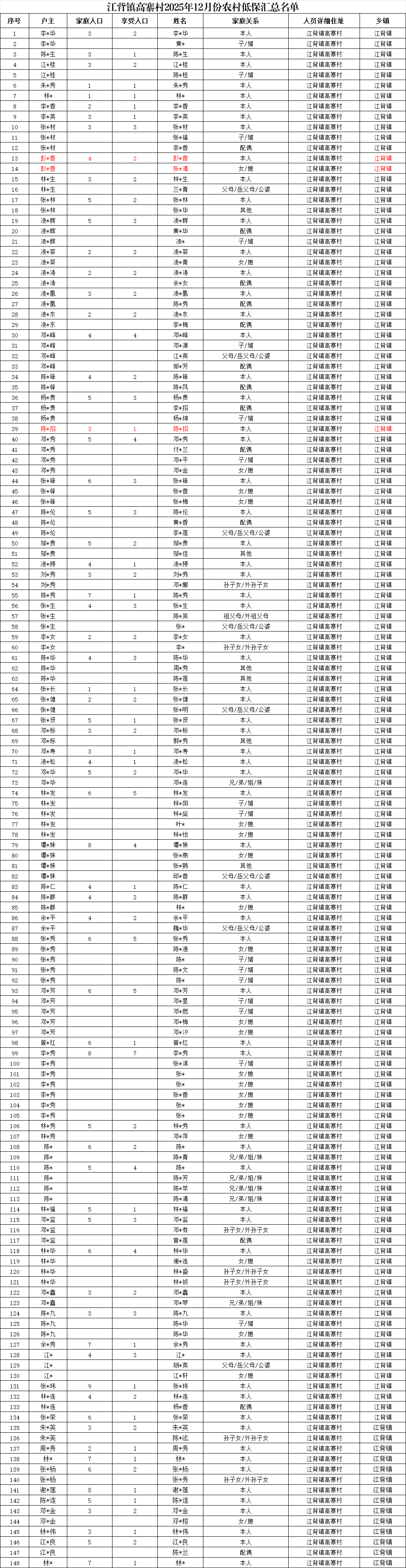 【社會救助】江背鎮高寨村2025年12月份農村低保匯總名單