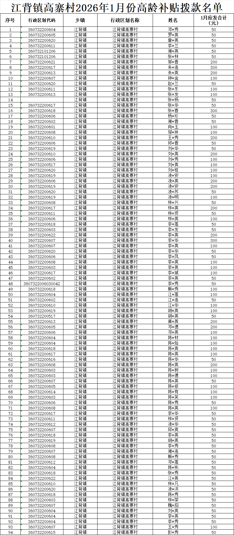 【養(yǎng)老服務(wù)】江背鎮(zhèn)高寨村2026年1月份高齡補(bǔ)貼撥款名單