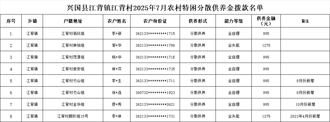 【社會救助】興國縣江背鎮江背村2025年7月農村特困分散供養金撥款名單