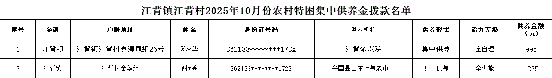 【社會救助】江背鎮江背村2025年10月份農村特困集中供養金撥款名單