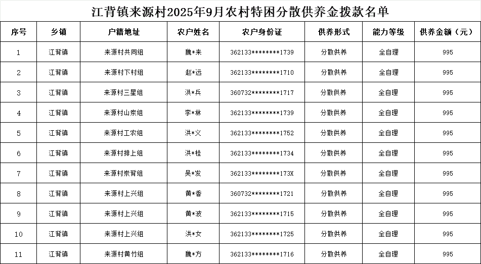 【社會救助】江背鎮(zhèn)來源村2025年9月農(nóng)村特困分散供養(yǎng)金撥款名單