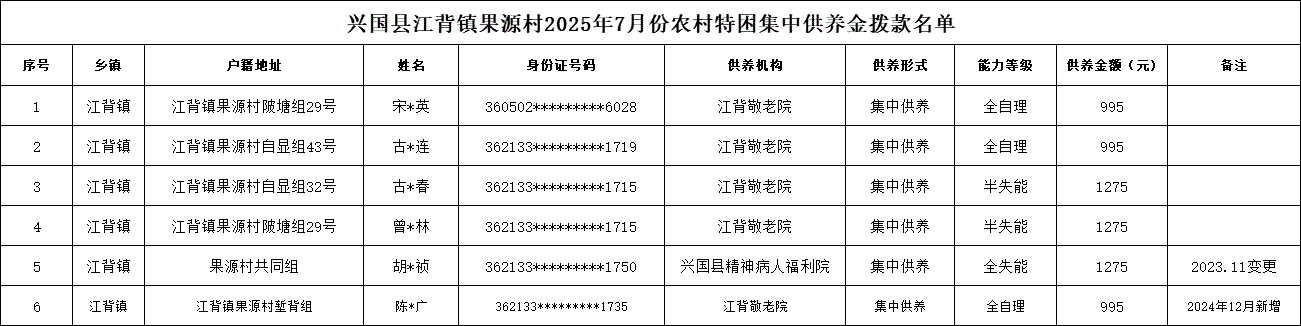 【社會救助】興國縣江背鎮果源村2025年7月份農村特困集中供養金撥款名單