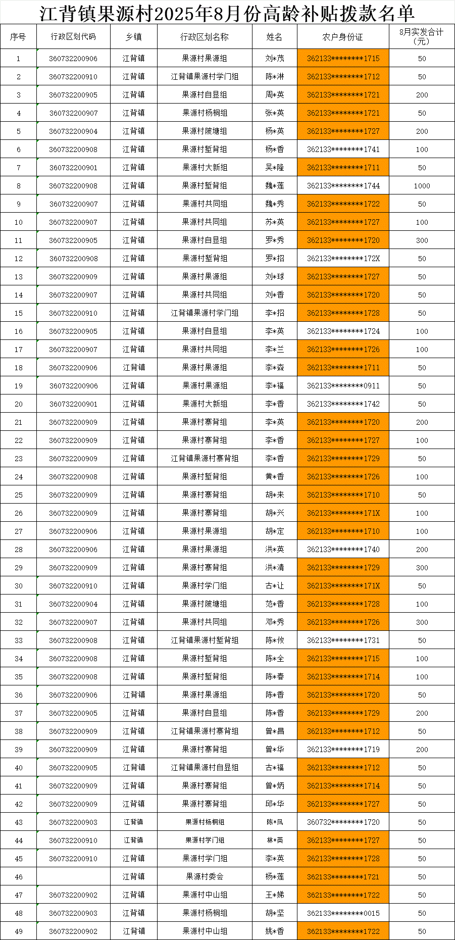 【養老服務】江背鎮果源村2025年8月份高齡補貼撥款名單