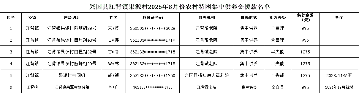【社會救助】江背鎮(zhèn)果源村2025年8月份農(nóng)村特困集中供養(yǎng)金撥款名單