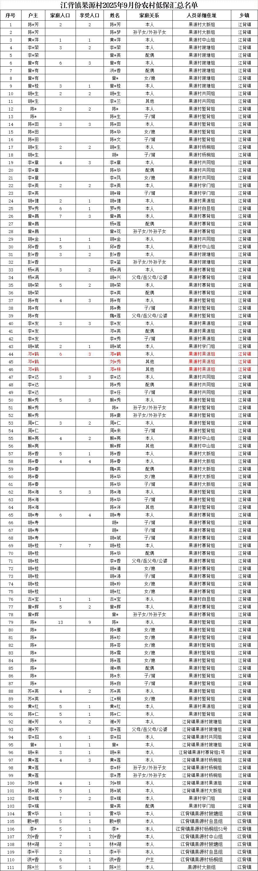 【社會救助】江背鎮果源村2025年9月份農村低保匯總名單