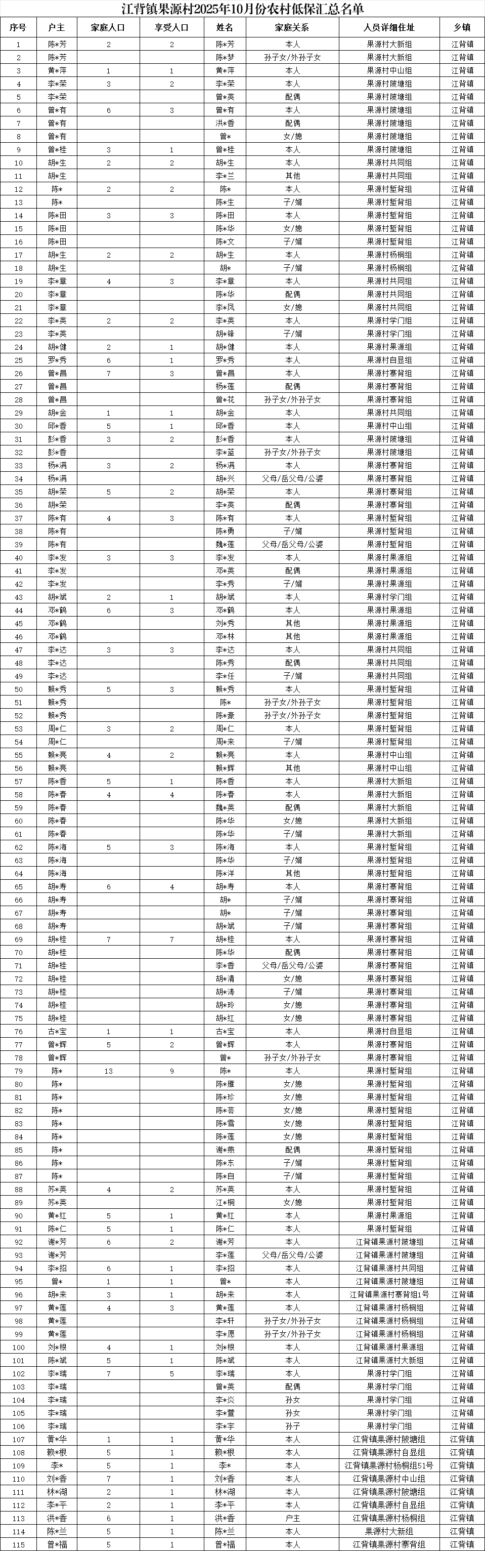 【社會救助】江背鎮果源村2025年10月份農村低保匯總名單