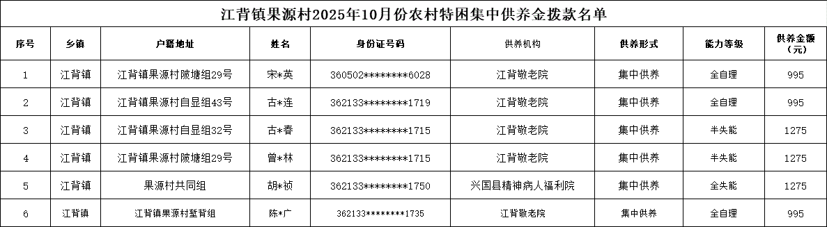 【社會救助】江背鎮果源村2025年10月份農村特困集中供養金撥款名單