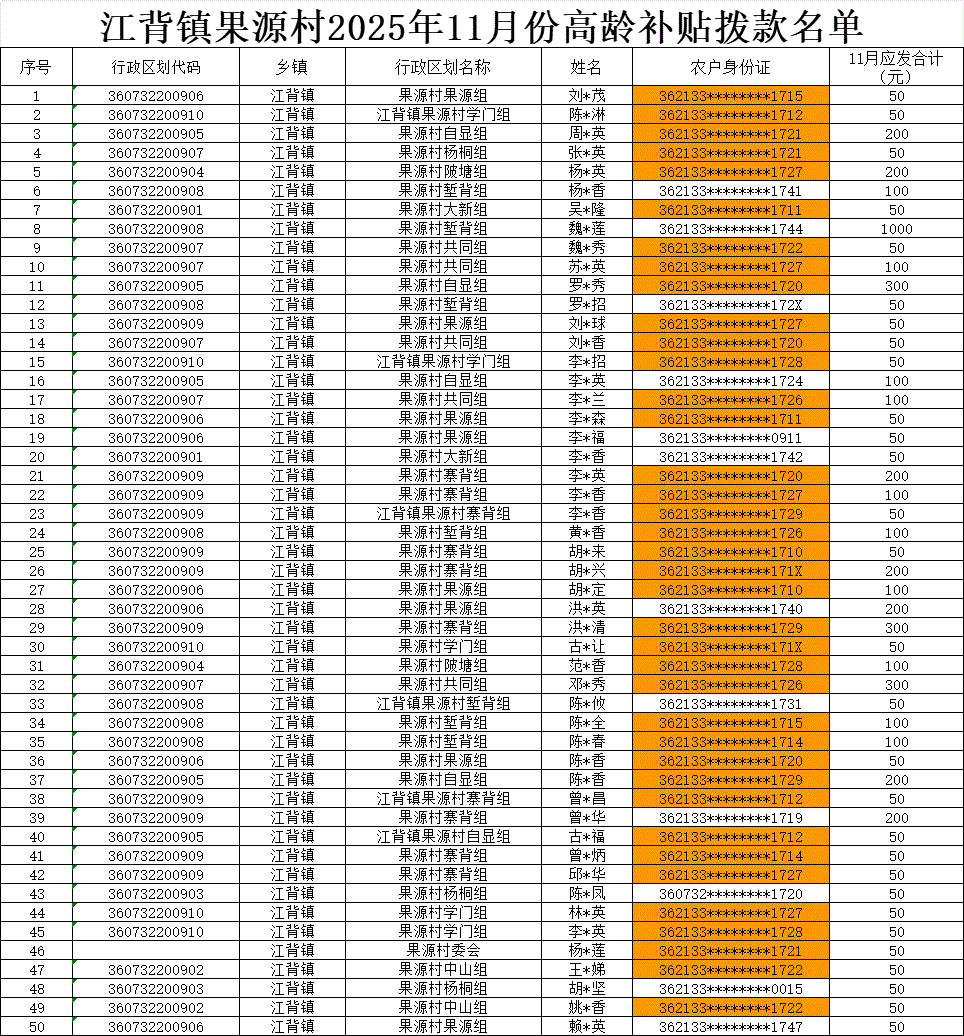 【養(yǎng)老服務(wù)】江背鎮(zhèn)果源村2025年11月份高齡補貼撥款名單