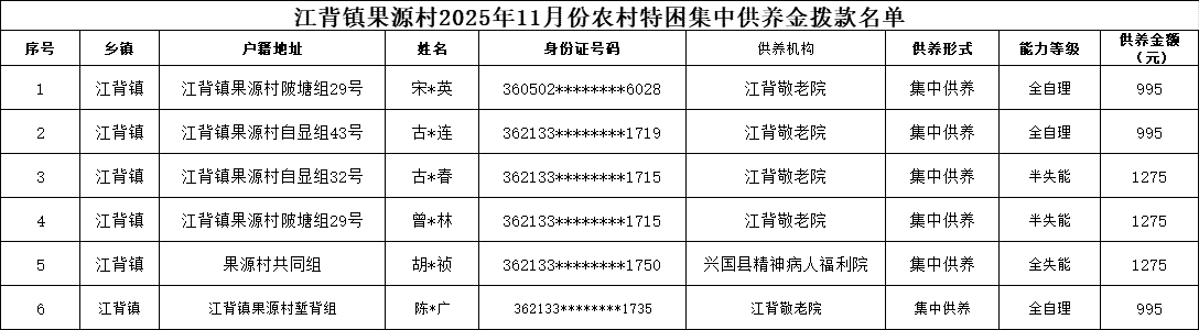 【社會(huì)救助】江背鎮(zhèn)果源村2025年11月份農(nóng)村特困集中供養(yǎng)金撥款名單