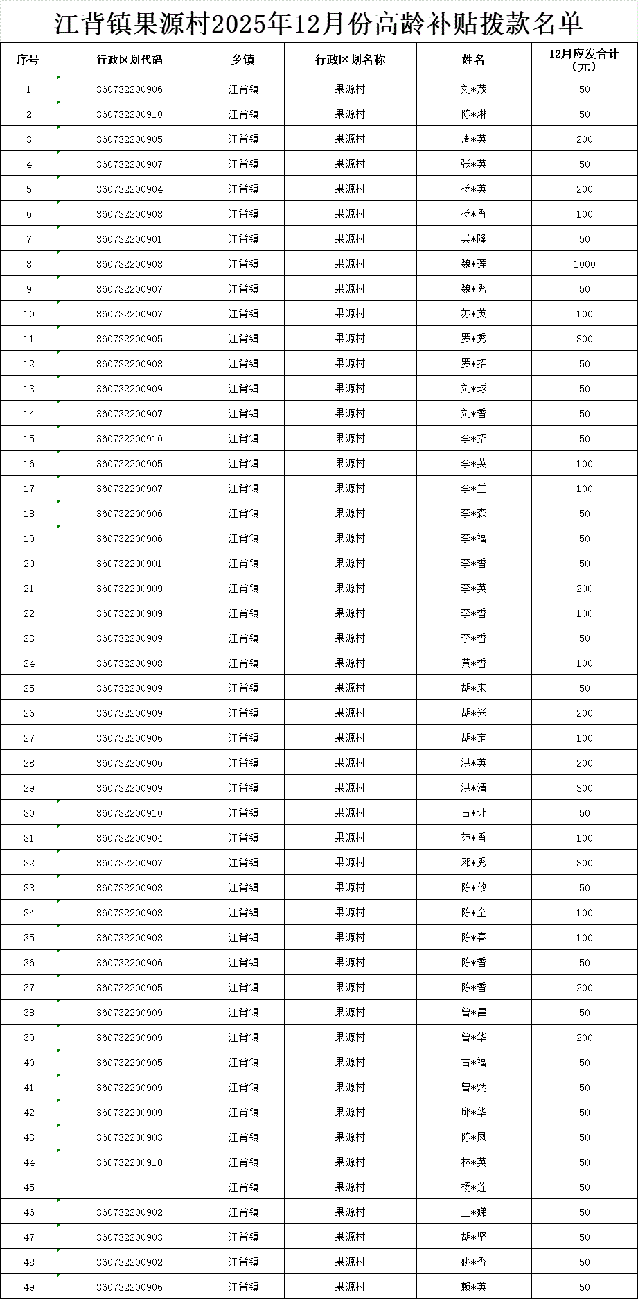 【養老服務】江背鎮果源村2025年12月份高齡補貼撥款名單