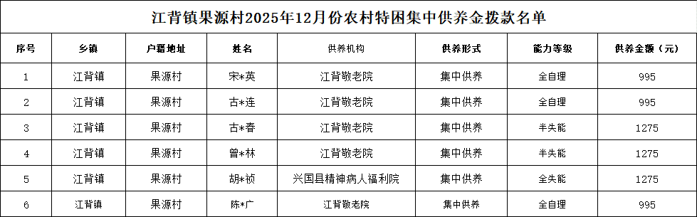 【社會救助】江背鎮(zhèn)果源村2025年12月份農(nóng)村特困集中供養(yǎng)金撥款名單