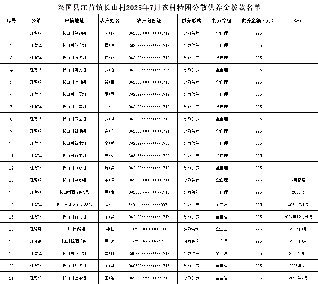 【社會(huì)救助】興國縣江背鎮(zhèn)長山村2025年7月農(nóng)村特困分散供養(yǎng)金撥款名單