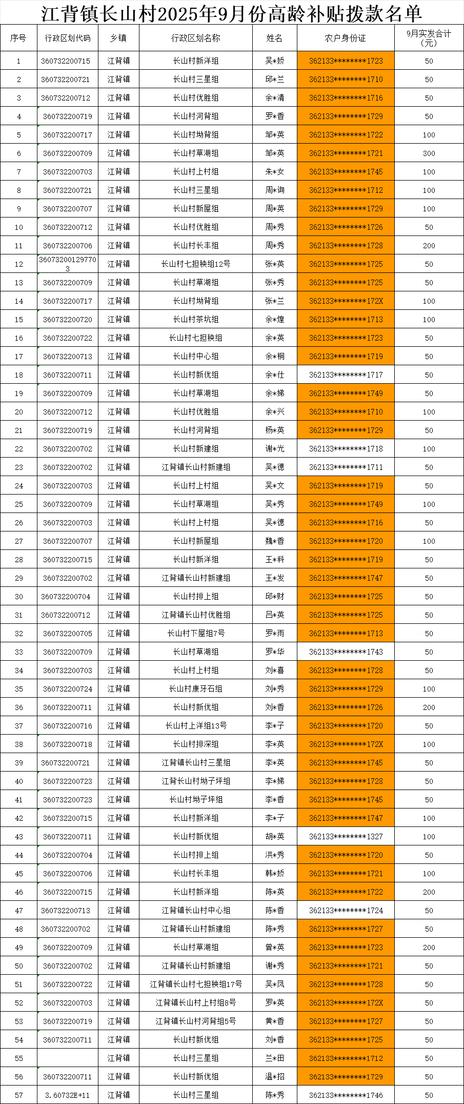 【養(yǎng)老服務】江背鎮(zhèn)長山村2025年9月份高齡補貼撥款名單