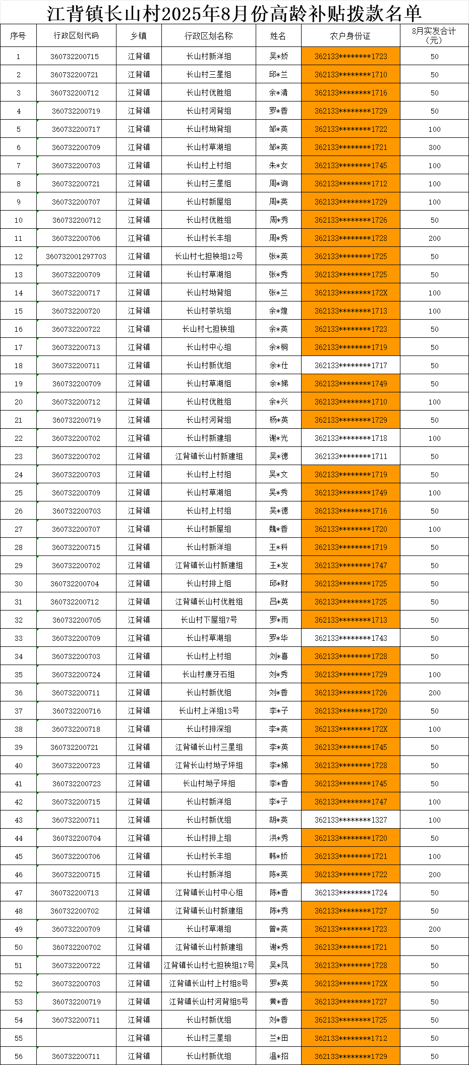 【養老服務】江背鎮長山村2025年8月份高齡補貼撥款名單