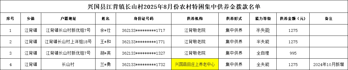 【社會(huì)救助】江背鎮(zhèn)長(zhǎng)山村2025年8月份農(nóng)村特困集中供養(yǎng)金撥款名單