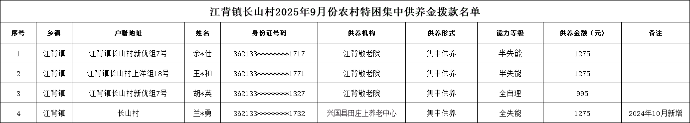 【社會救助】江背鎮長山村2025年9月份農村特困集中供養金撥款名單