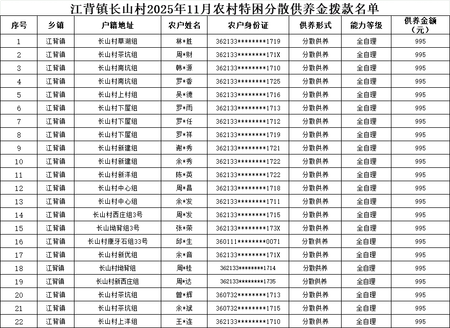 【社會救助】江背鎮長山村2025年11月農村特困分散供養金撥款名單