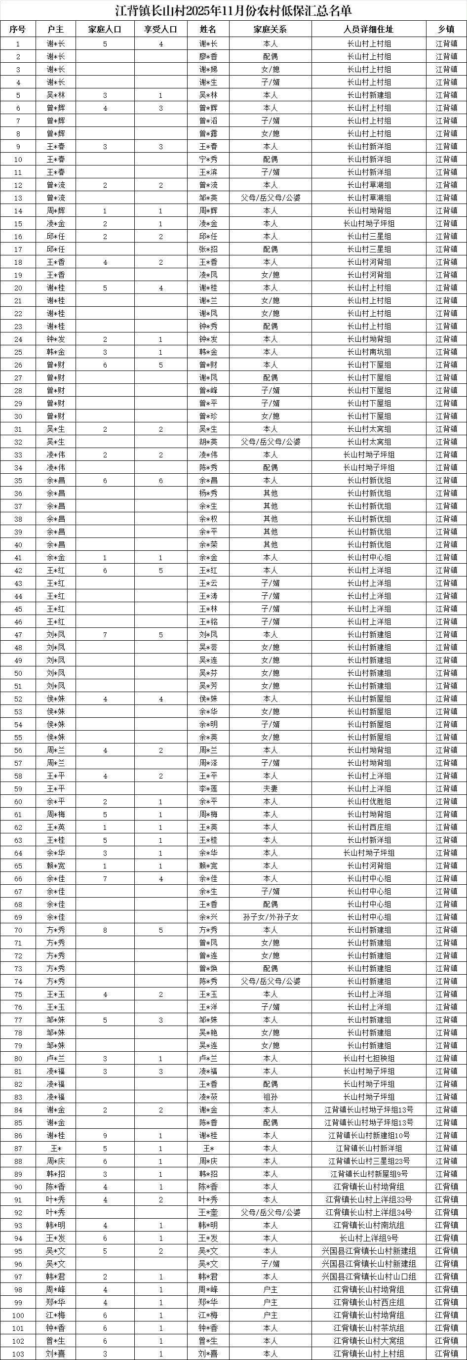 【社會救助】江背鎮長山村2025年11月份農村低保匯總名單