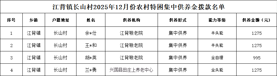 【社會救助】江背鎮長山村2025年12月份農村特困集中供養金撥款名單