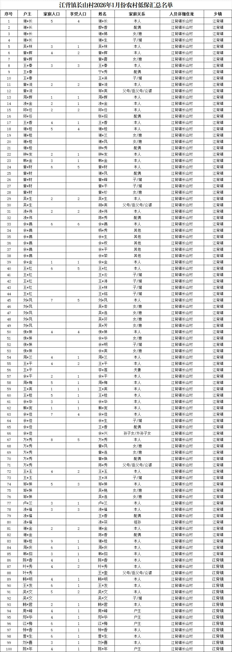 【社會救助】江背鎮長山村2026年1月份農村低保匯總名單
