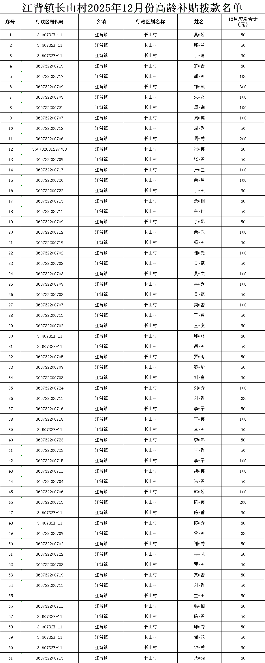 【養老服務】江背鎮長山村2025年12月份高齡補貼撥款名單