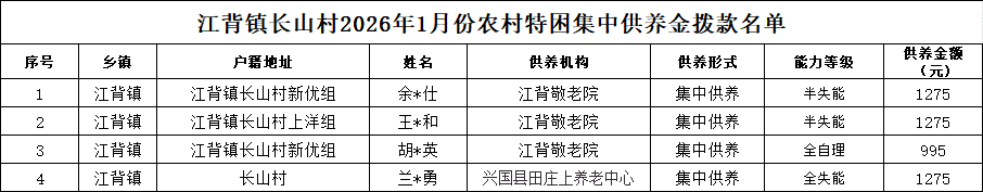 【社會救助】江背鎮(zhèn)長山村2026年1月份農(nóng)村特困集中供養(yǎng)金撥款名單