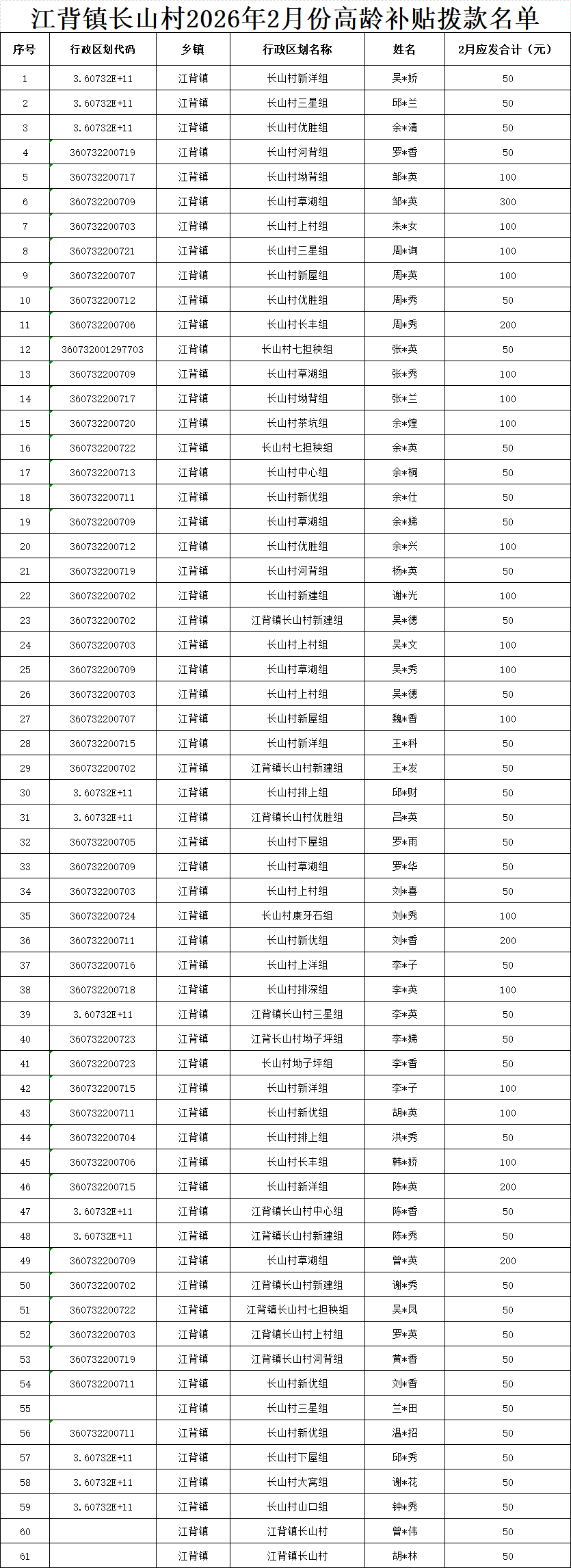 【養(yǎng)老服務(wù)】江背鎮(zhèn)長(zhǎng)山村2026年2月份高齡補(bǔ)貼撥款名單