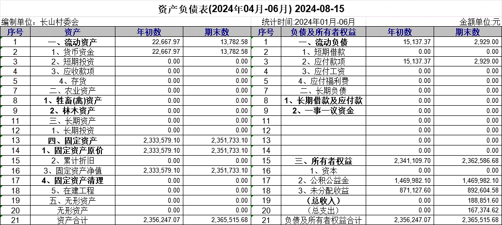 【財務(wù)收支】長山村2024年第二季度資產(chǎn)負(fù)債表公示