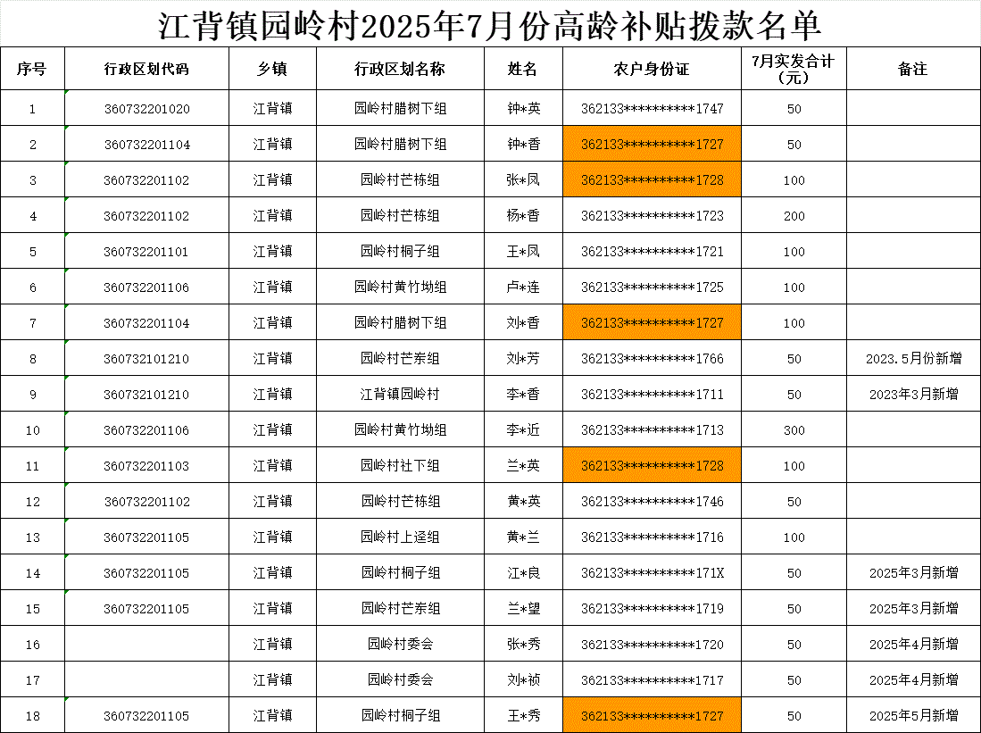 【養(yǎng)老服務(wù)】江背鎮(zhèn)園嶺村2025年7月份高齡補(bǔ)貼撥款名單