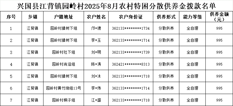 【社會救助】江背鎮園嶺村2025年8月農村特困分散供養金撥款名單