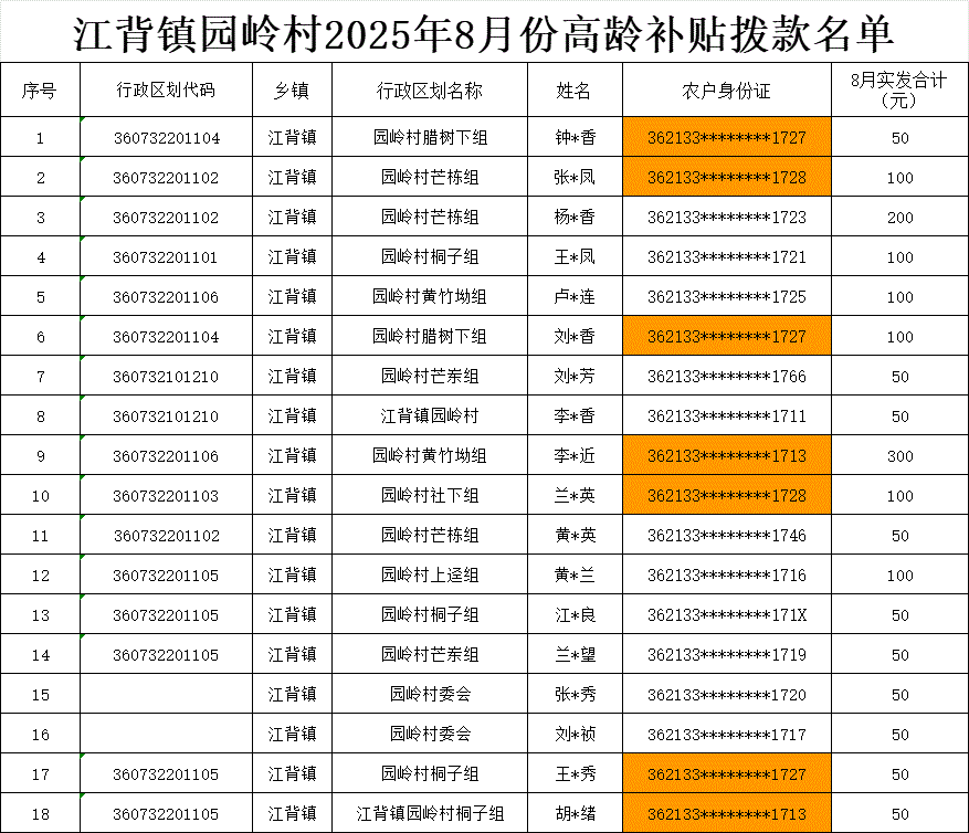 【養老服務】江背鎮園嶺村2025年8月份高齡補貼撥款名單
