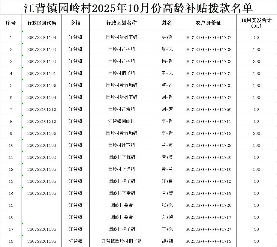 【養老服務】江背鎮園嶺村2025年10月份高齡補貼撥款名單