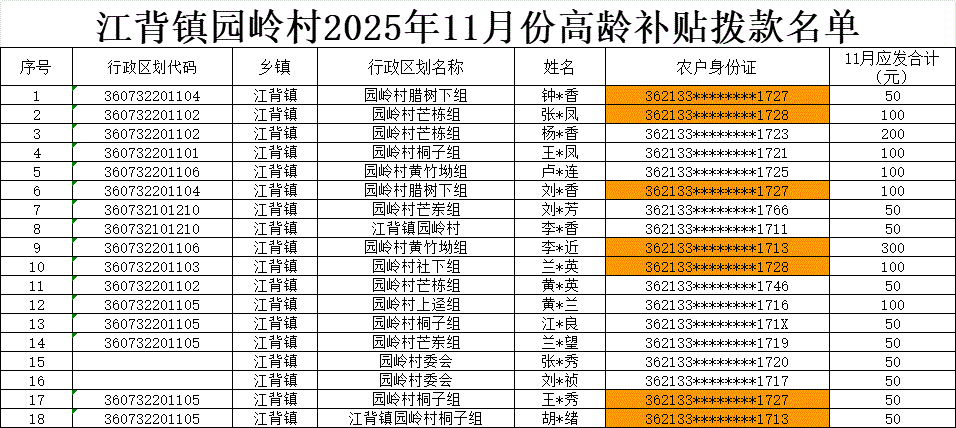 【養老服務】江背鎮園嶺村2025年11月份高齡補貼撥款名單