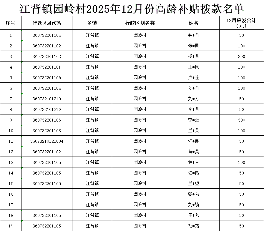 【養老服務】江背鎮園嶺村2025年12月份高齡補貼撥款名單