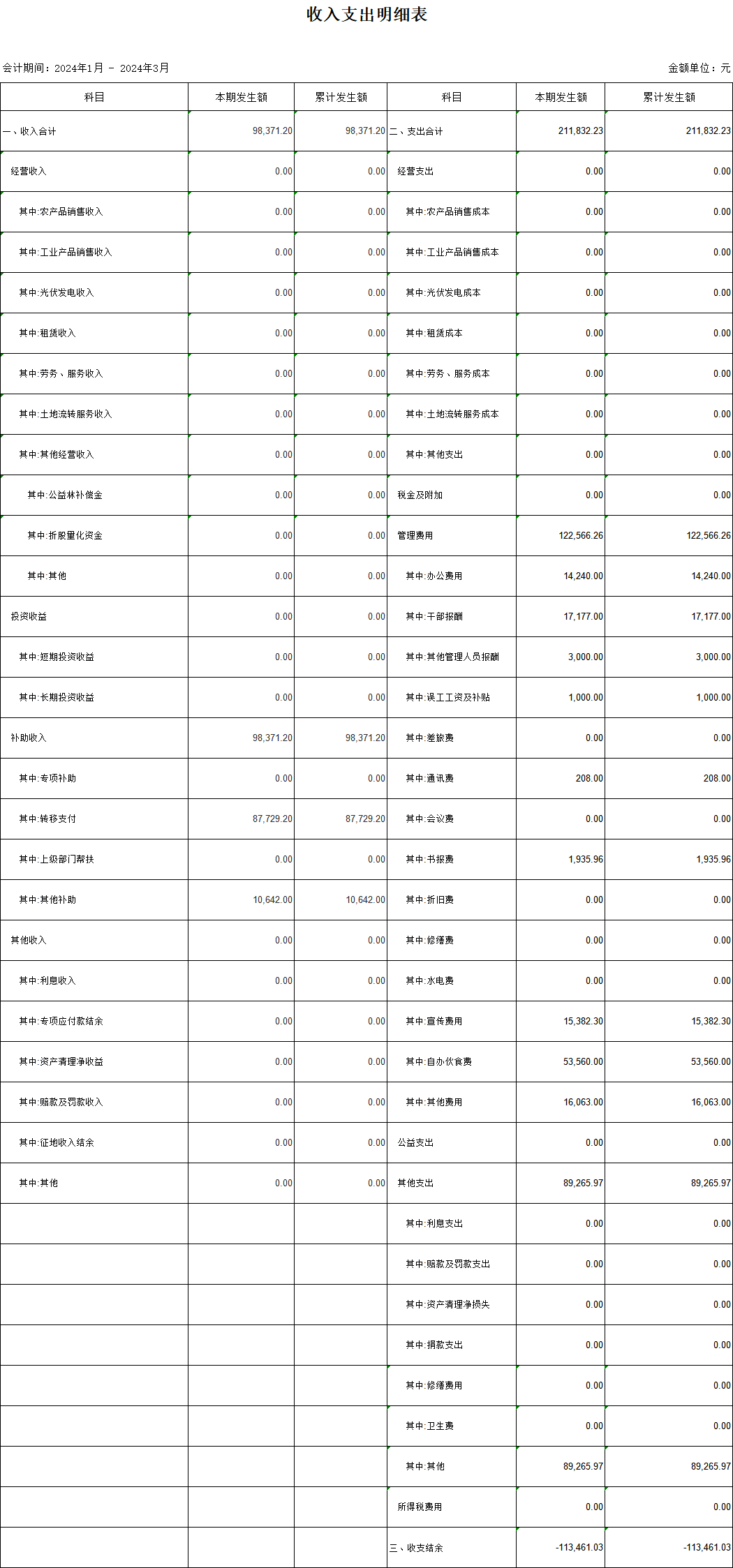 【財務收支】園嶺村2024年第一季度收支明細表公示