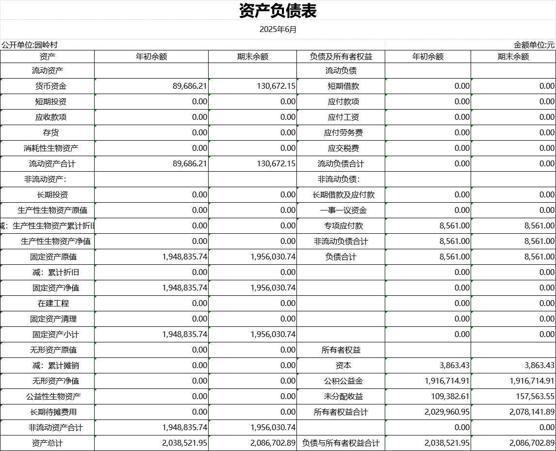 【財務收支】園嶺村2025年第二季度資產負債表公示