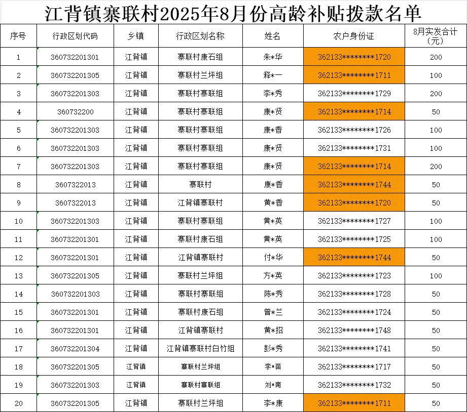 【養老服務】江背鎮寨聯村2025年8月份高齡補貼撥款名單
