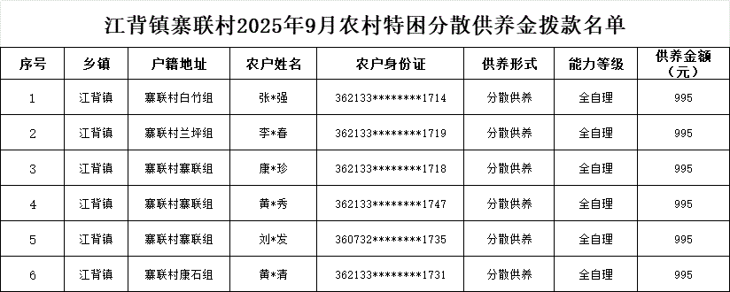 【社會救助】江背鎮寨聯村2025年9月農村特困分散供養金撥款名單