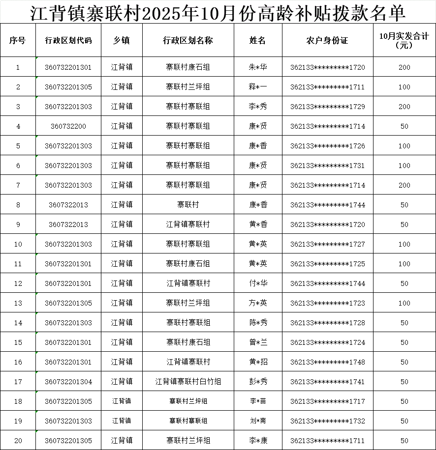 【養老服務】江背鎮寨聯村2025年10月份高齡補貼撥款名單