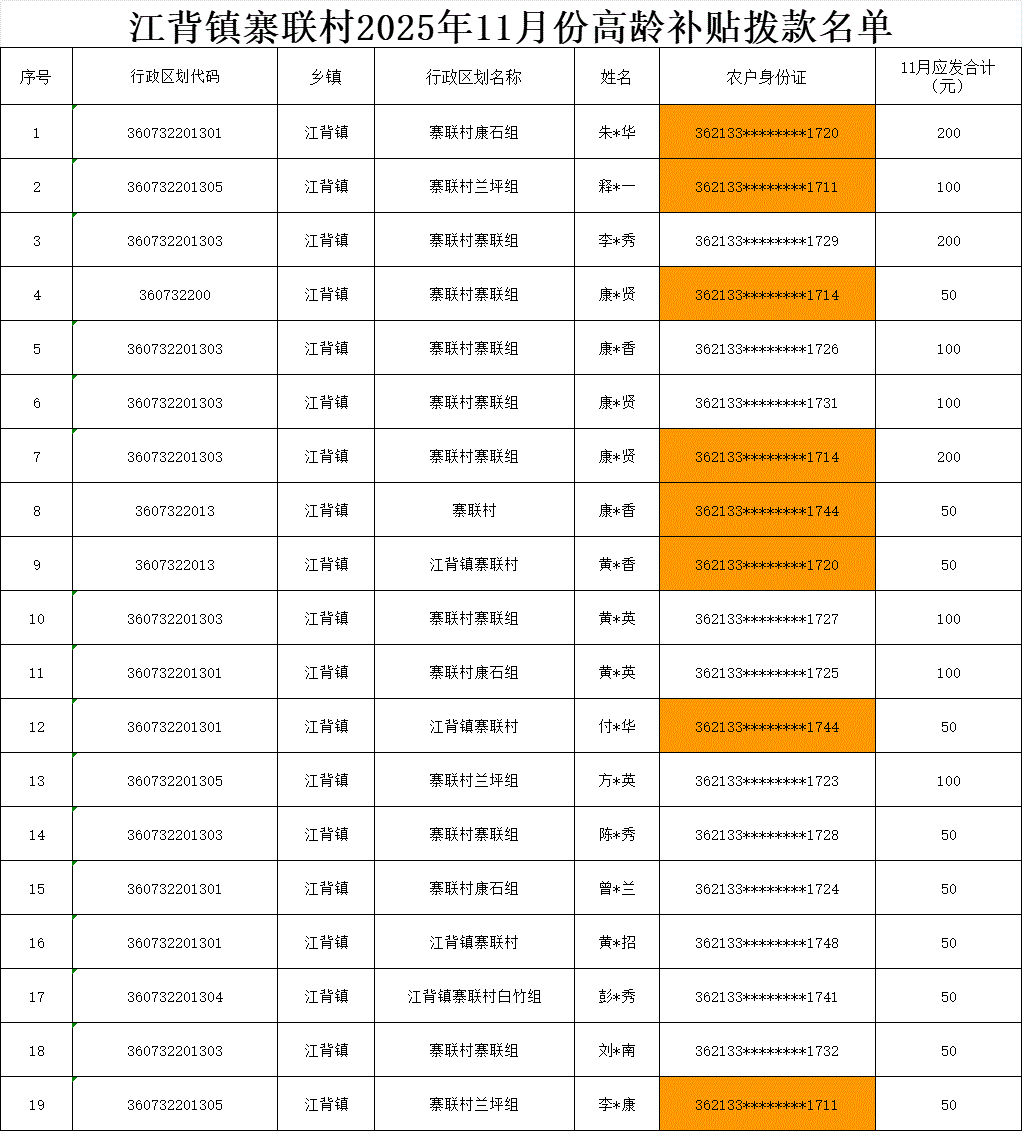 江背鎮寨聯村2025年11月份高齡補貼撥款名單