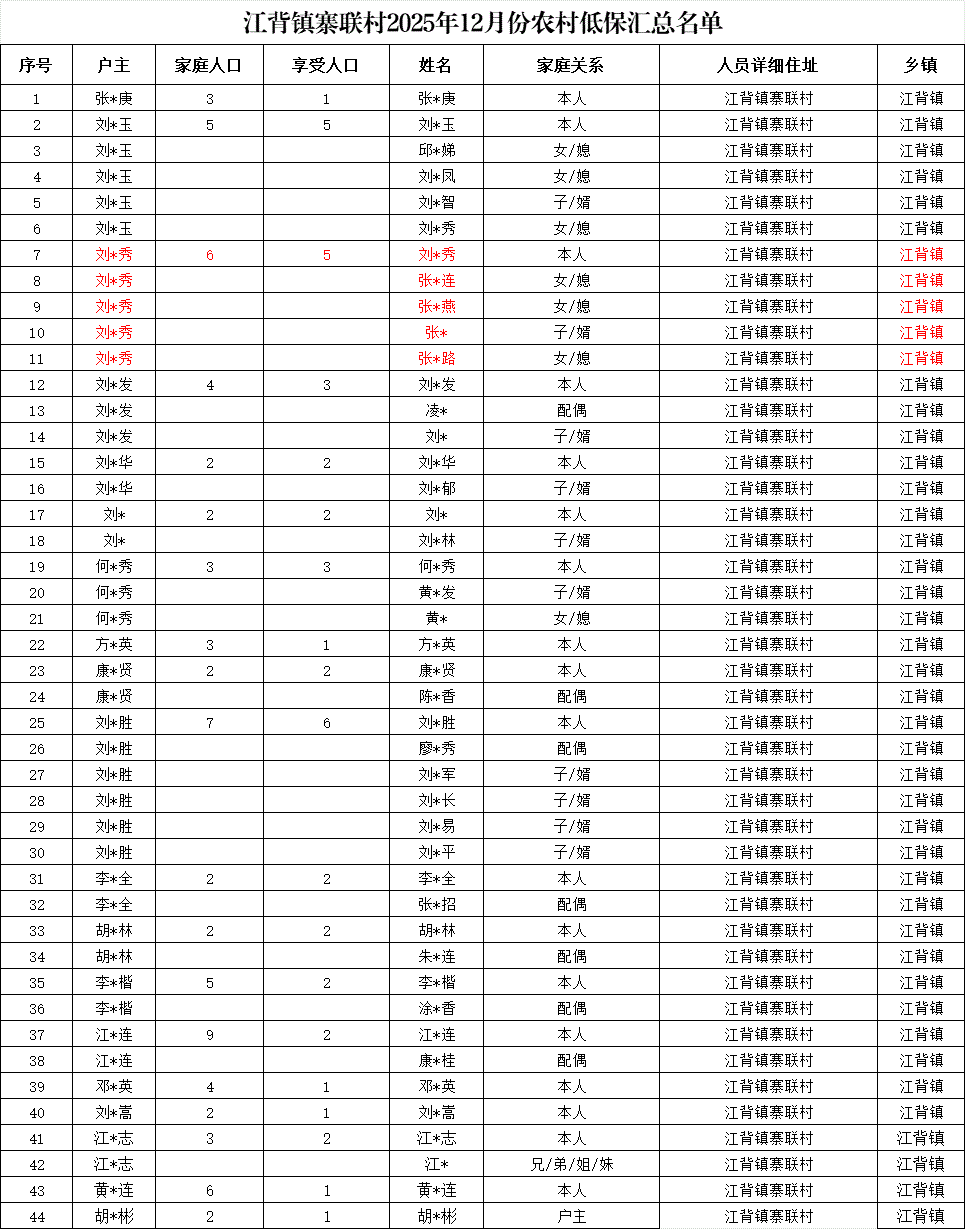 【社會救助】江背鎮寨聯村2025年12月份農村低保匯總名單