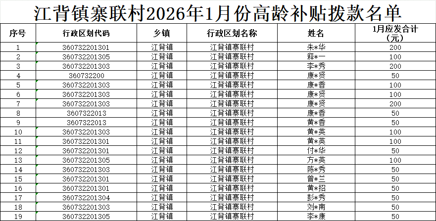 【養老服務】江背鎮寨聯村2026年1月份高齡補貼撥款名單